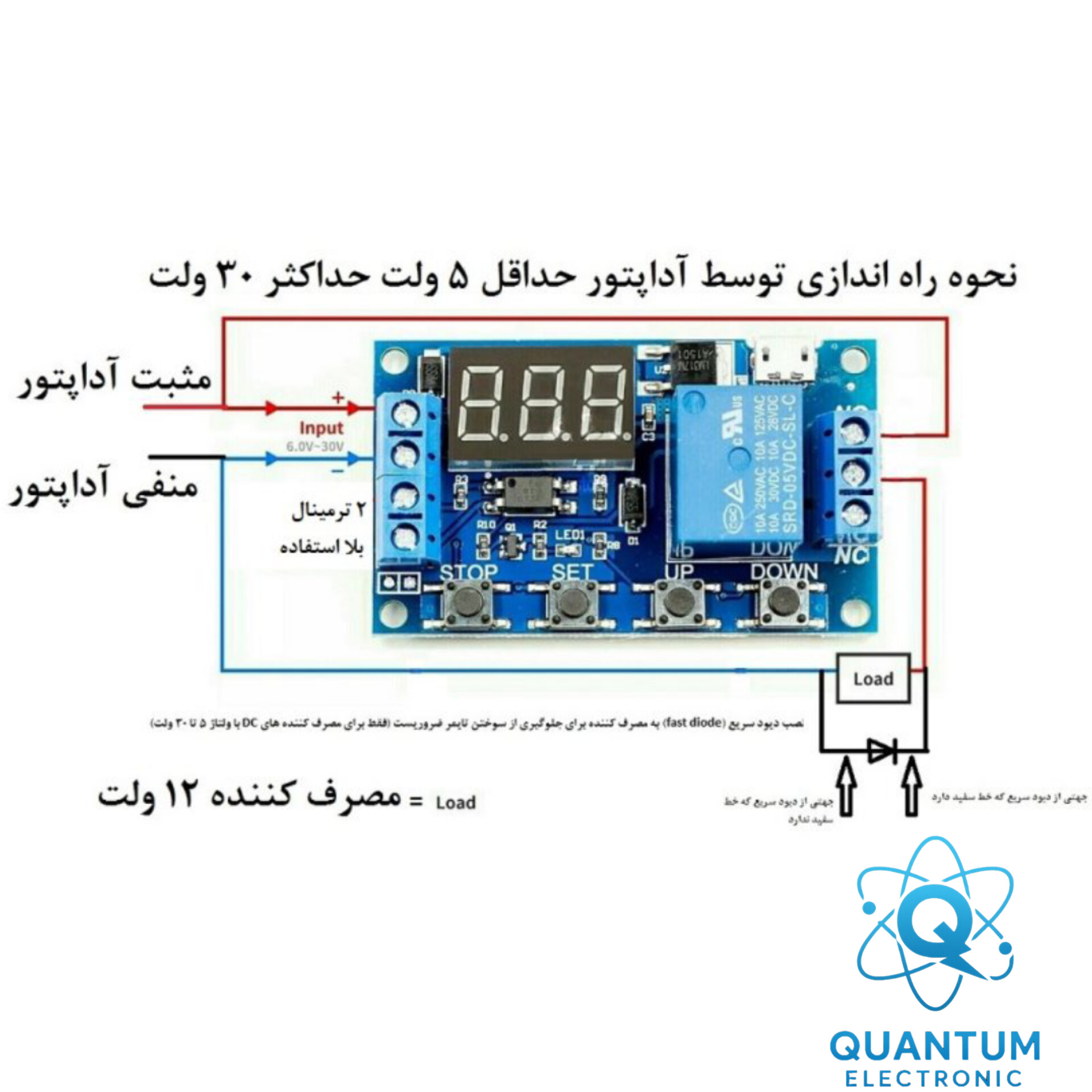 برای تنظیم، ابتدا کلید SET را فشار دهید تا وارد حالت تنظیم شوید. سپس با کلیدهای UP و DOWN مقدار زمان دلخواه را انتخاب کنید. در پایان، با فشردن دوباره SET تنظیمات ذخیره میشوند. کلید STOP امکان توقف فوری عملکرد را فراهم میکند و با فشار مجدد، تایمر دوباره فعال میشود.